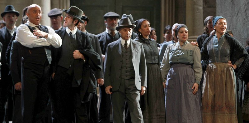 S’obre el teló i apareix una cantonada d’un poble de Sicília, la de l’església amb la taverna de la mamma Lucia. És diumenge de Pasqua, hi ha processó i això és Cavalleria rusticana. I sí, s’ensuma per endavant la tragèdia. La història va d’honor, banyes i crim per gelosia. L’escenari del Liceu es vas veure per a l’ocasió de tons pedra – molt ottocentista, sense translació espacial o temporal respecte del llibret-; per uns grans finestrals apuntaran les gents del poble, tafaners del melodrama que ha de tenir lloc a la plaça.